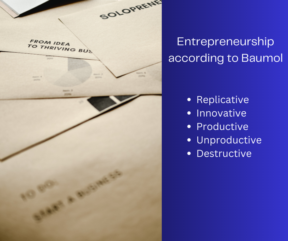 Baumol maakt onderscheid tussen entrepreneurs en managers (zie ook Kirzner in een eerdere blog). De manager moet bestaande processen efficiënter maken en de onderneming’s productief potentieel maximaliseren. De entrepreneur begint een nieuwe business, zelfs als het iets is wat al bestaat. In een dergelijk geval noemt Baumol dat type entrepreneur een “replicative entrepreneur”.